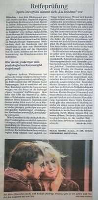 ... Doch die Incognita-Leute haben Lust, das Groß könnte eh leicht auf größeren Bühnen bestehen [...]. Martin Summer (Colline), der mit Boris-Wumm ans Werk geht, dürfte seinen Bass noch zurücknehmen. Auch Rodrigo Trosino hat ein bisschen viel schluchzenden Villazón geguckt, findet aber im Duett mit der wunderbar